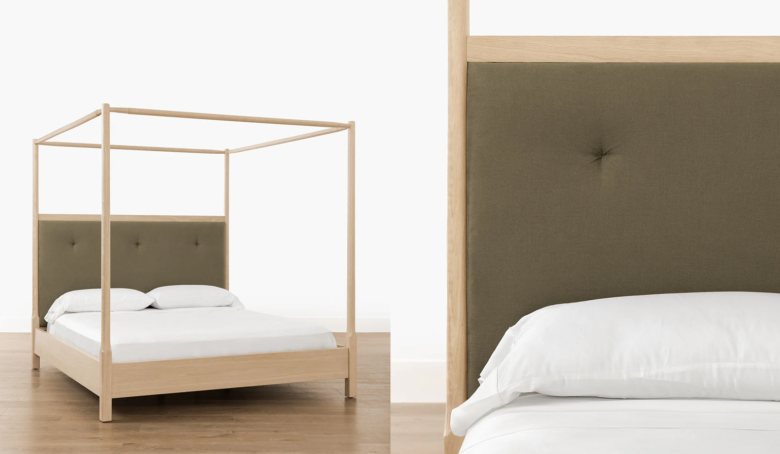 Elevated & intentional, the Gilmore features a tufted, mossy green headboard within an oak frame.