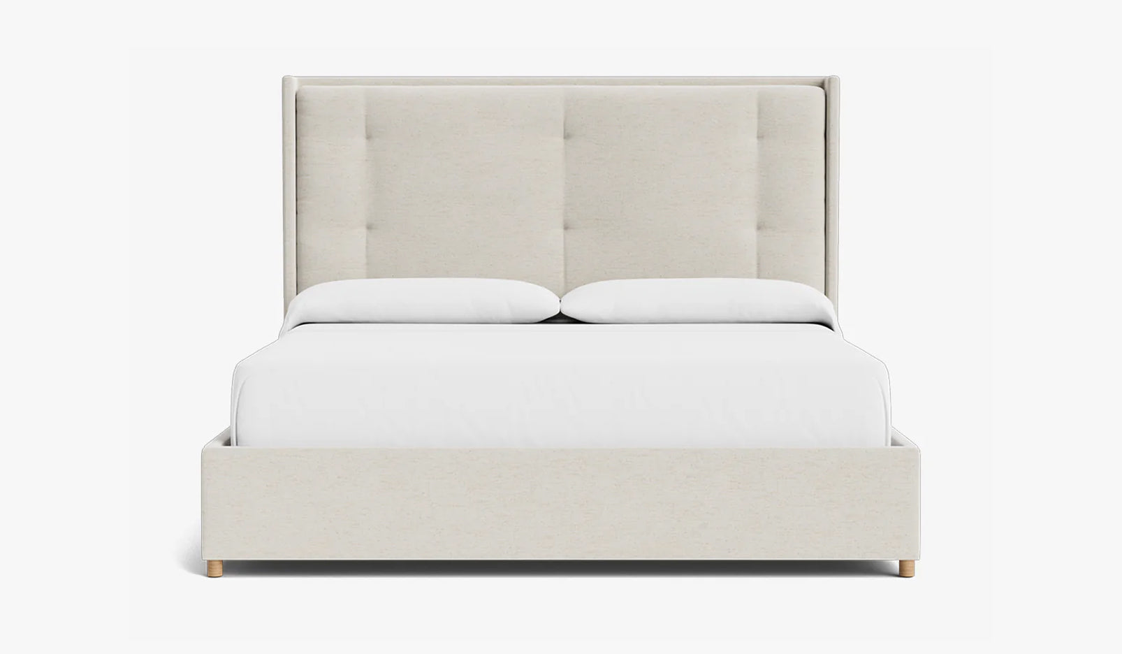 The tufted headboard & wood block feet bring simplicity & elegance to bedroom designs.
