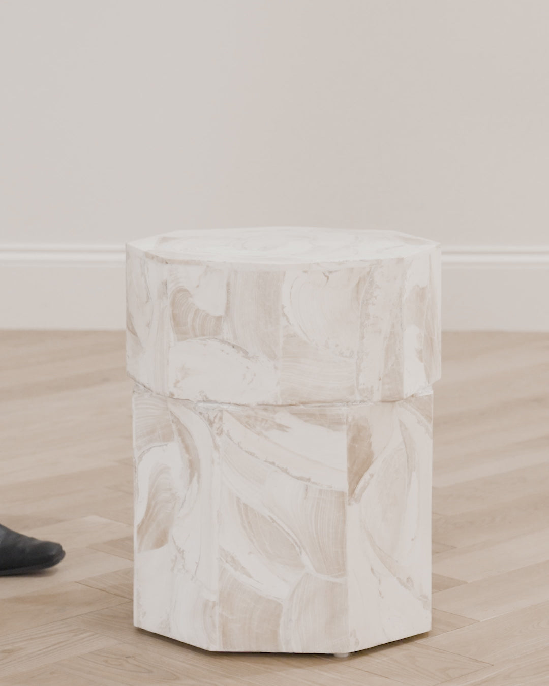 Made from an ivory fossilized clam shell composite material, our Andrade Side Table is truly unique. Playing with shape, its octagonal form and offset tabletop are bold and artful, making this side table an intriguing and contemporary piece in your living room styling.