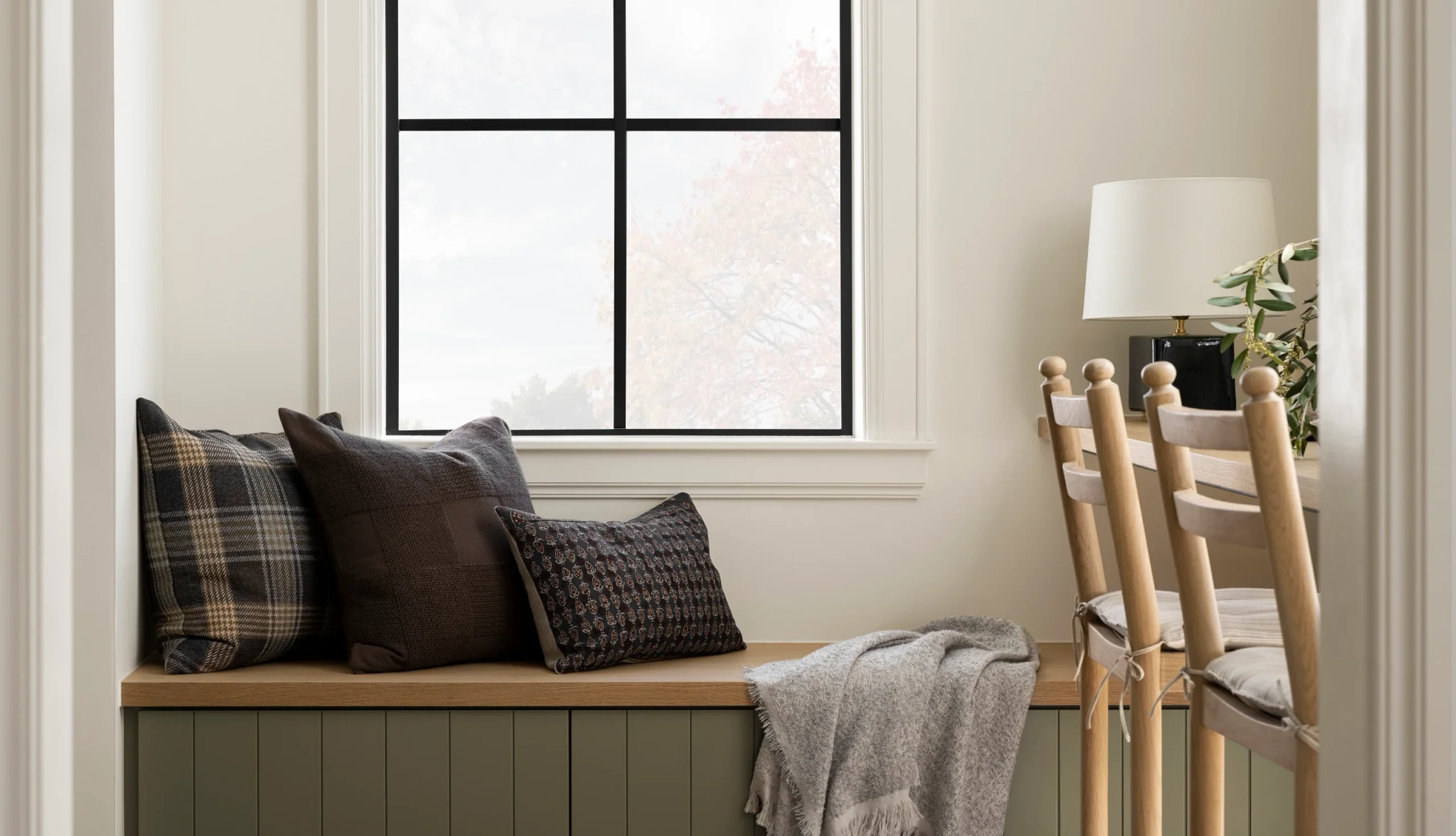 In a seating nook or bench setting, a consistent look can achieve a welcoming feel without overcomplicating the space. Two pillows of a similar size, color palette, texture, or pattern on one side or both will create an elegant and cohesive look.