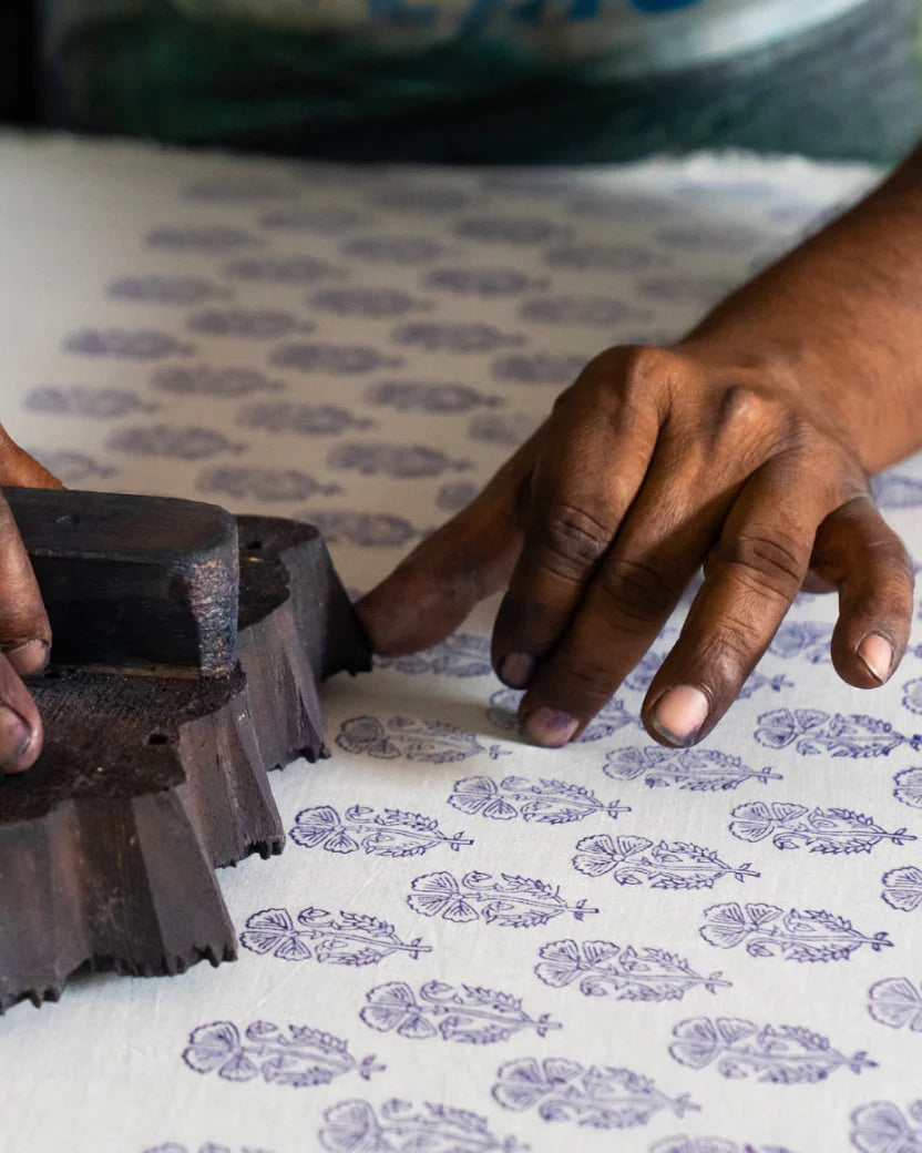 About: Block printing involves manually carving a solid material, typically wood, by skilled artisans who then apply ink or dye onto fabric in a repeating pattern.
