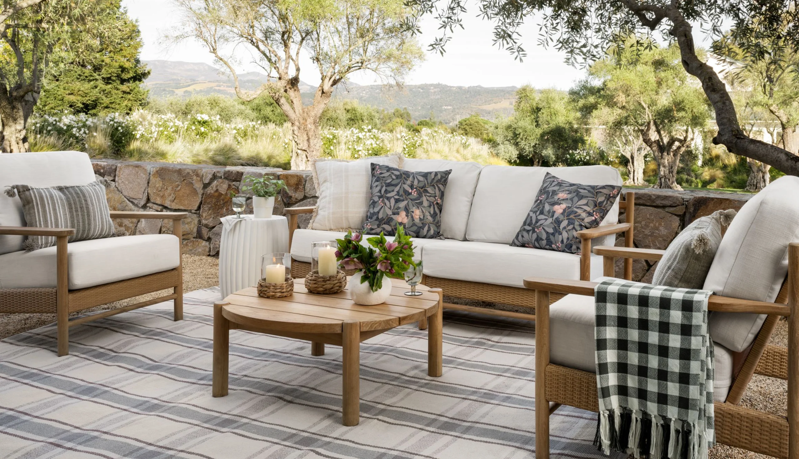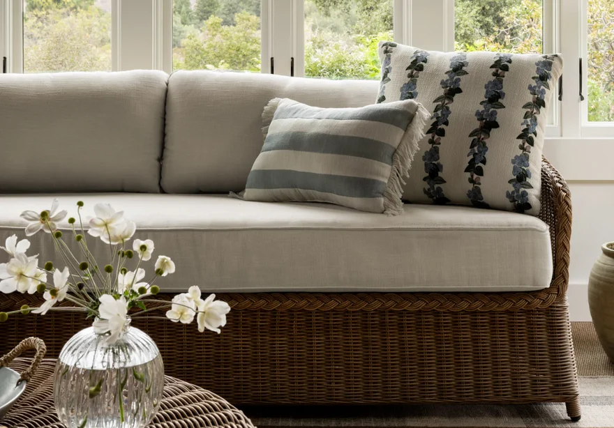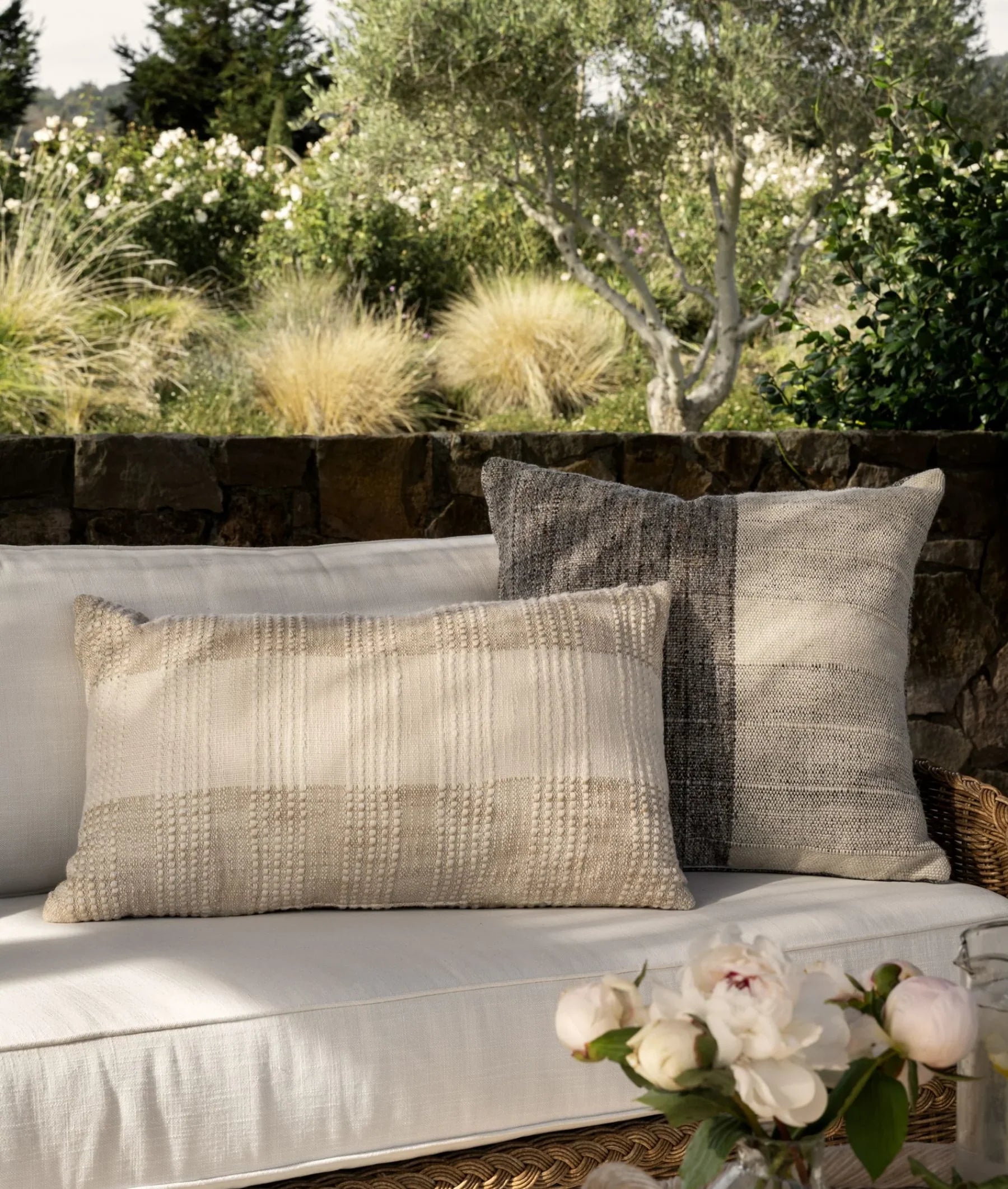 Regardless of the piece of furniture your pillows are styled on, always choose Indoor/Outdoor pillows for your backyard or patio spaces. Our Indoor/Outdoor pillows are intentionally crafted to withstand outdoor conditions with both patterned and solid pillow covers made from PET.