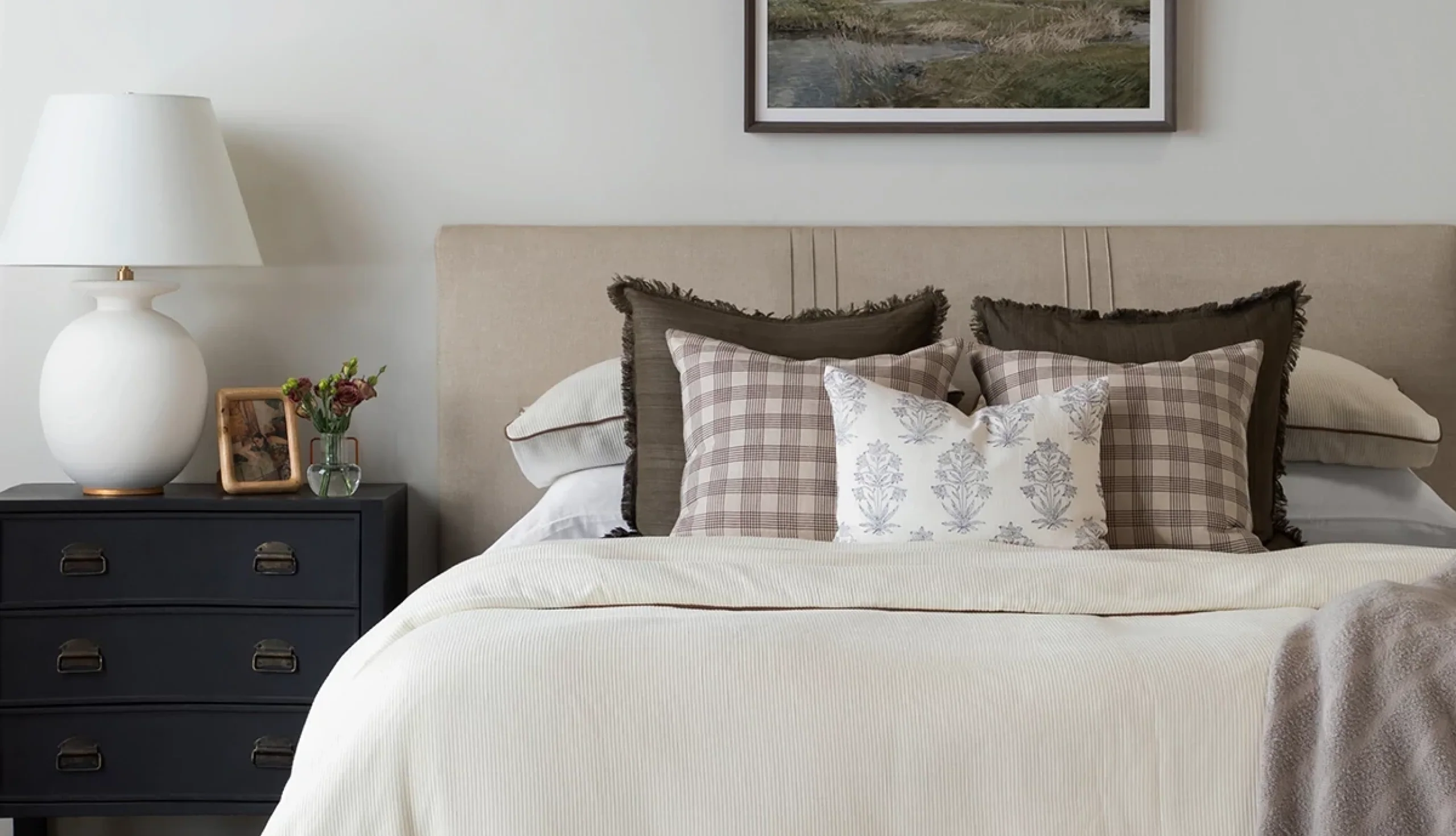 Pillow styling is a playful and accessible way to express personal style in your home. Whether you’re leaning towards a modern layered and mixed pattern look or a traditional streamlined look, it’s useful to know where to start. We recommend picking a design element in the room—pattern, texture, color—that you’re passionate about, and building the look of the pillow vignette around it through complementary choices.