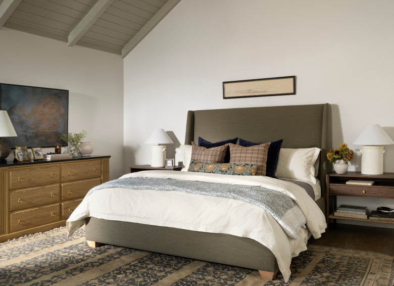 Begin with a foundation of crisp white sheets, then incorporate pillows and blankets in autumn hues for a bed you’ll have a hard time getting out of.