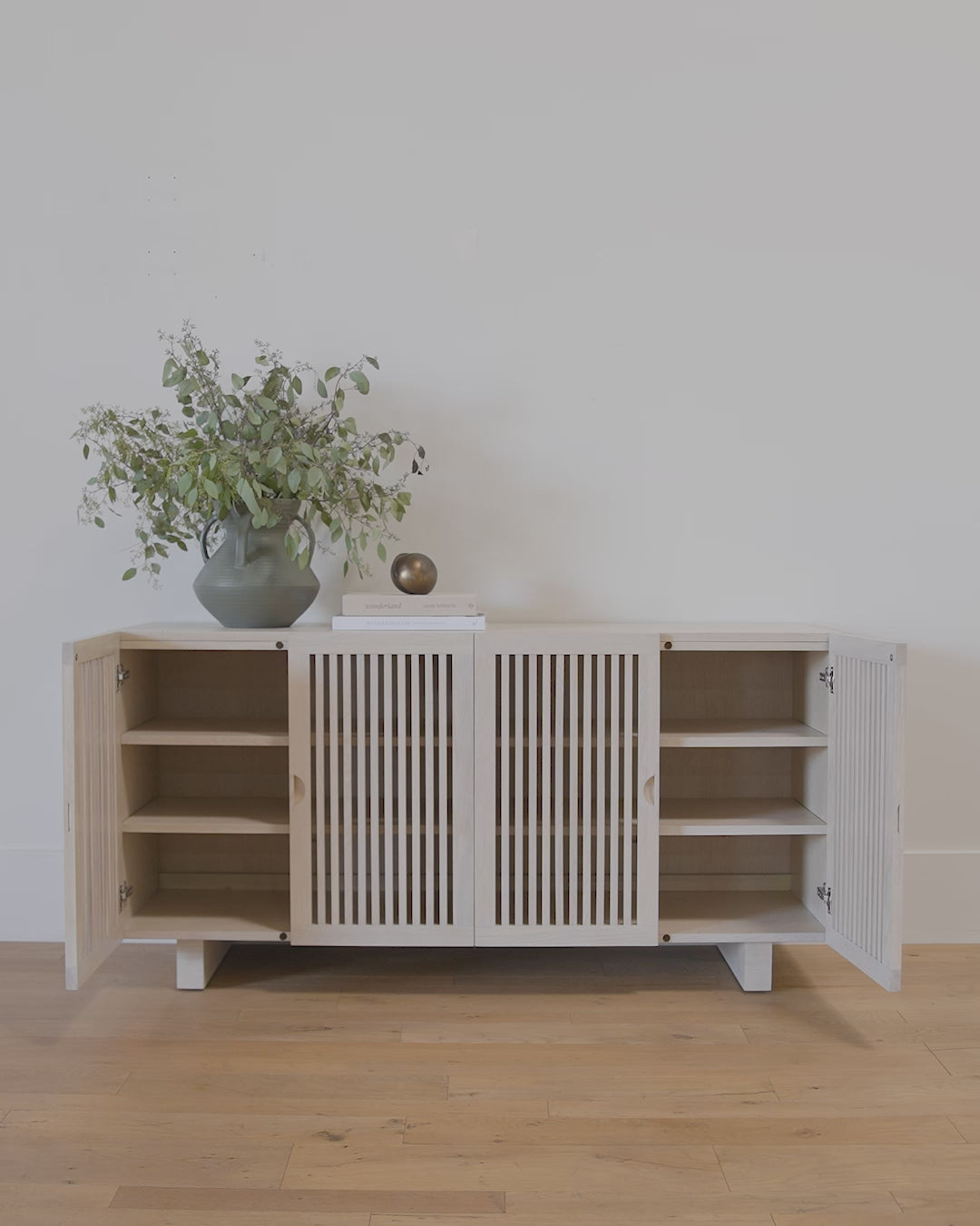 Crafted from solid oak, our Alvin Sideboard is a modern sideboard that makes a subtle statement in your space with its classic console structure. With open slats on the front doors of the sideboard and inset handles formed by two half circles, the intentional details of this modern sideboard bring sophistication to your decor wherever it is placed.