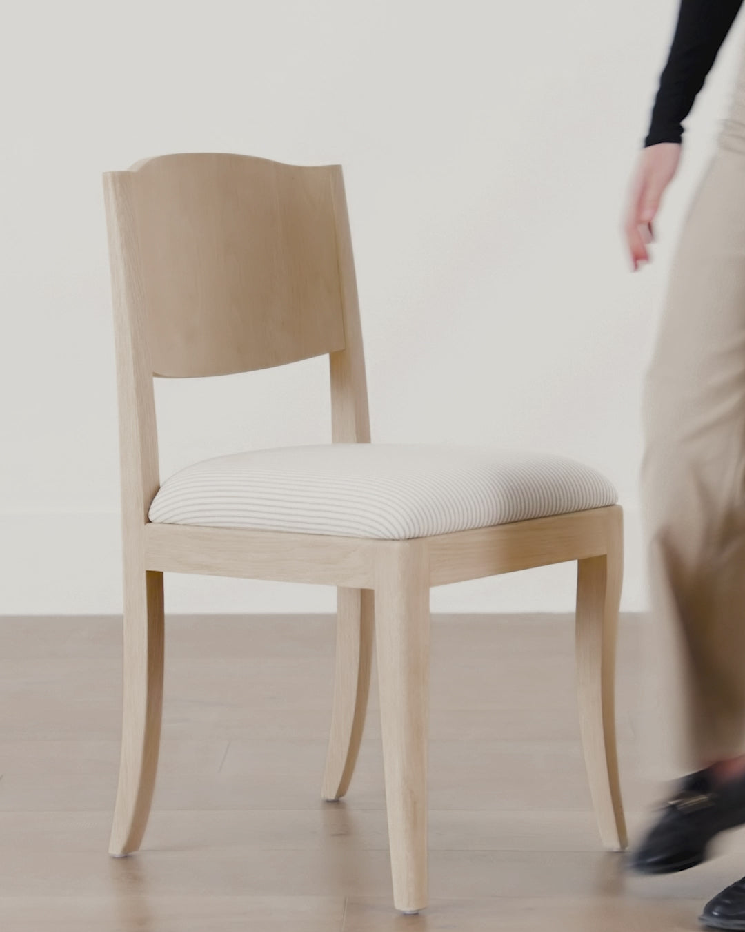 Designed with a white oak frame, the Shepherd Dining Chair plays with shape and material. With curved details in the structure for a classic feel and an upholstered seat cushion, the dining chair invites you to relax and sit comfortably for a while.